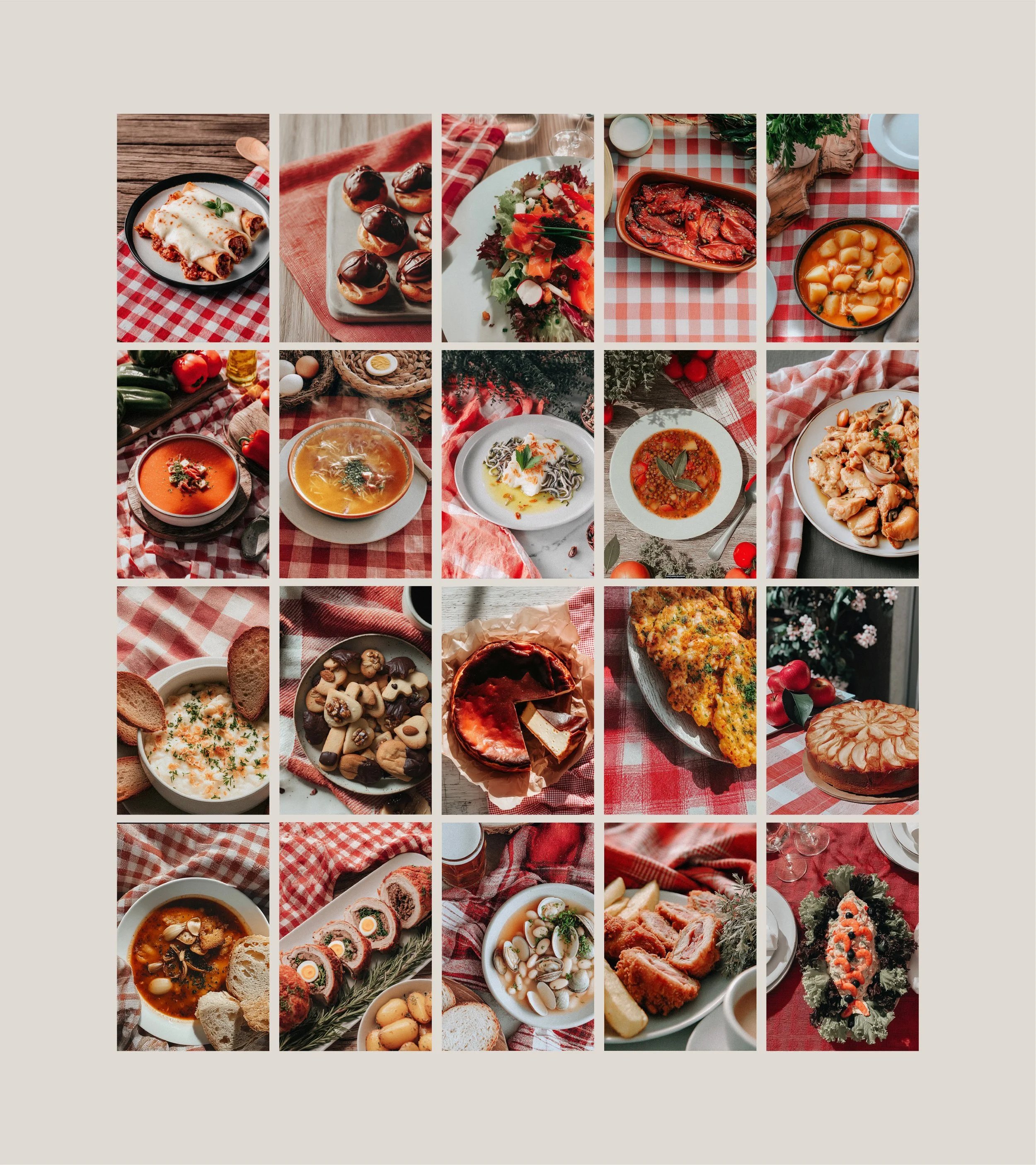 Mi labor como directora de arte fue articular un diálogo entre el respeto por el documento original y las posibilidades de las herramientas digitales. Diseñé una arquitectura editorial limpia que prioriza la jerarquía de los textos y la fluidez de la lectura, permitiendo que la receta respire. Para solucionar la falta de imágenes de los platos, utilicé inteligencia artificial generativa (Midjourney) como herramienta de co-creación. Partiendo de las referencias visuales de mi tía, generé una serie de ilustraciones gastronómicas con una iluminación y estilo unificados, logrando un look and feel profesional que el material de archivo no podía proporcionar.