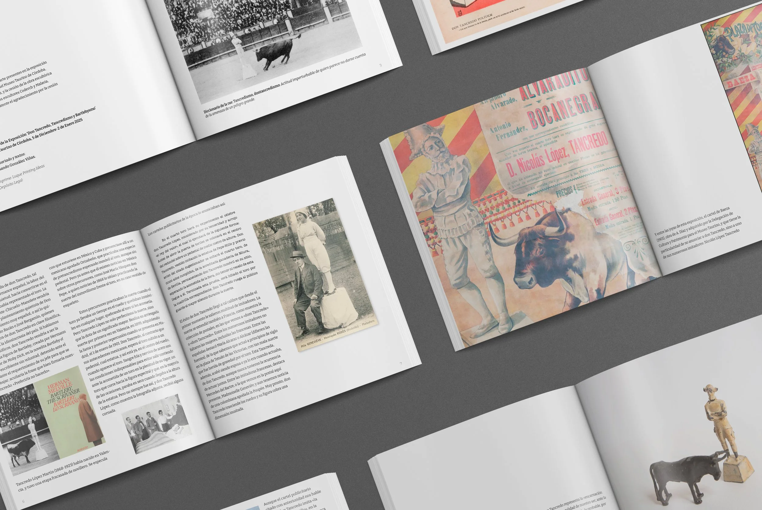 A principios del siglo XX, Tancredo López se convirtió en un fenómeno de masas mediante una premisa tan simple como arriesgada: quedarse inmóvil sobre un pedestal en mitad del ruedo, confiando en que la falta de movimiento lo haría invisible ante el toro. Su impacto fue tal que no solo traspasó fronteras, sino que se integró en el lenguaje (R.A.E.) y en el imaginario visual de la época a través de postales, revistas satíricas y el cine. El objetivo del proyecto fue dar forma a una exposición que recuperase esta figura histórica, analizando su influencia en la cultura popular española.